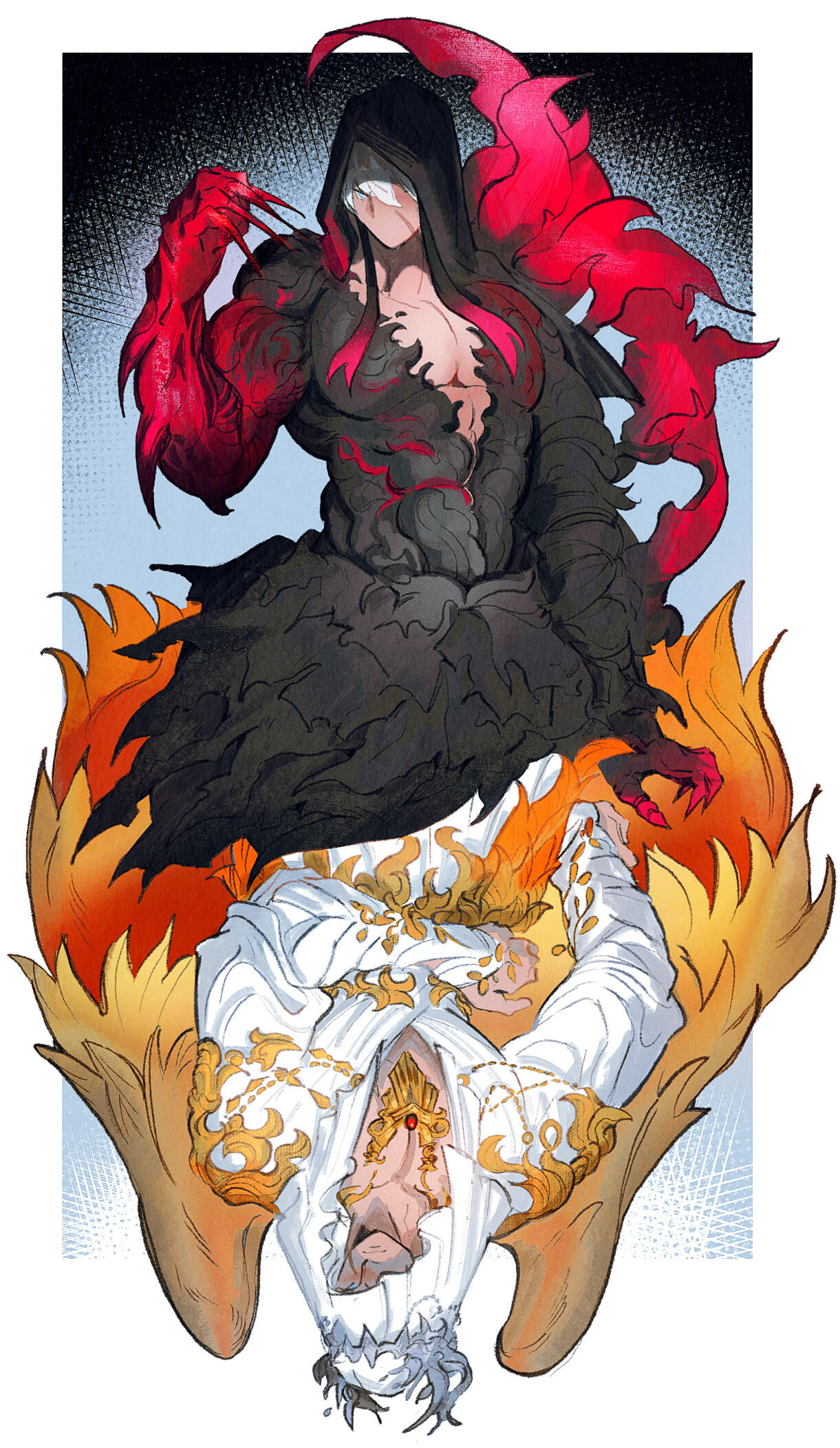 This duty of his, this burden- each day as it passes it grows yet more onerous, weighing down on him-The years passed by and its weight grew more and more crushing-But then, a flicker of light, a call back to his duty and-He saw it again, that blinding light from a soul so intimate and familiar to him. He reached out and-It flickered at his touch, a feeble mimicry of what it used to be but still, still-Warm. So very warm.He shrivelled away, withdrawing to the shadows. No, no he couldn’t- he had to continue onwards, he was the only one left.None would stop his mission.