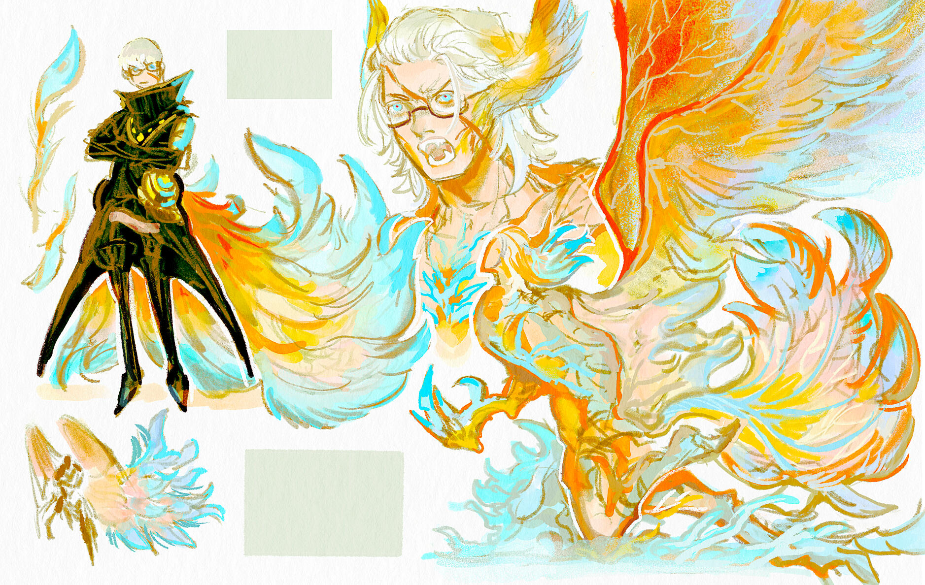 The first thing someone says to him when he wakes up in the bale of hay is forever seared into his mind.“Ahoy, lad! That’s a fantastic tattoo on that back of yours- never seen one like that in all my years around these places. You got someplace ya gotta go?”He spits out the mouthful of hay in his mouth, gags, and turns his head to face the speaker. A hearty Sea Wolf stares back at him, and that is when he realises he is buck naked.“Ah- pardon, sir-” He starts, face flaming red as he tries to wiggle deeper into the haystack. “I seem to have lost my undergarments.”The Roegadyn man roars in laughter at his predicament. “I can see that! Best you stay put lad, I’ll get you some of me son’s old things out for ya.”Later when he is clothed and fed by the kindly stranger and ushered into the guest room of the family house, he takes his borrowed shirt off and turns his back to the mirror.His eyes widened. On the top of his back, between his shoulder blades is etched a mark that had not existed the day before.A foreign tattoo he fails to recognise, one of the darkest black he’s had ever seen, is seared into his skin. He raises his arms to scratch at it and it doesn’t flake off, nor does it lighten in intensity.“What in the-” He swears as he spins around almost comically, nearly losing his balance.Where had this mark come from? It had definitely not been on his back before- before-----The red moon falling- closer, closer, closer- the screams of the men around him, Nael’s final words ringing, echoing in his ears-Wings of destruction unfurling before his ears- an earth shattering roar that is heard for yalms and yalms beyond- the prayers they chant rising, rising, rising-Bahamut- oh lord Bahamut, grant us your succor and your aid--He jerks back to the present, panting. He is sweating profusely, the mysterious tattoo standing out even more on his sweat painted back.Had Bahamut done this to him? Nael? Louisoix, when he had summoned the Twelve to his aid-?No, no, no- he had to find them all- ask them questions---Too late, too late, he was too late once again- they were all gone-- Five years since Carteneau, they told him. Five years too late, the words rang in his ears as he trudged around Limsa Lominsa. Nobody could recognise him, nor did they meet his requests for knowledge on the survival of the Circle of Knowing.It was as if they never existed, nor did he.But he is here now- and that mark on his back-He had no answers to his questions. But forward is all he can go, he acknowledges this grimly, as he steps into a new chapter of his story.